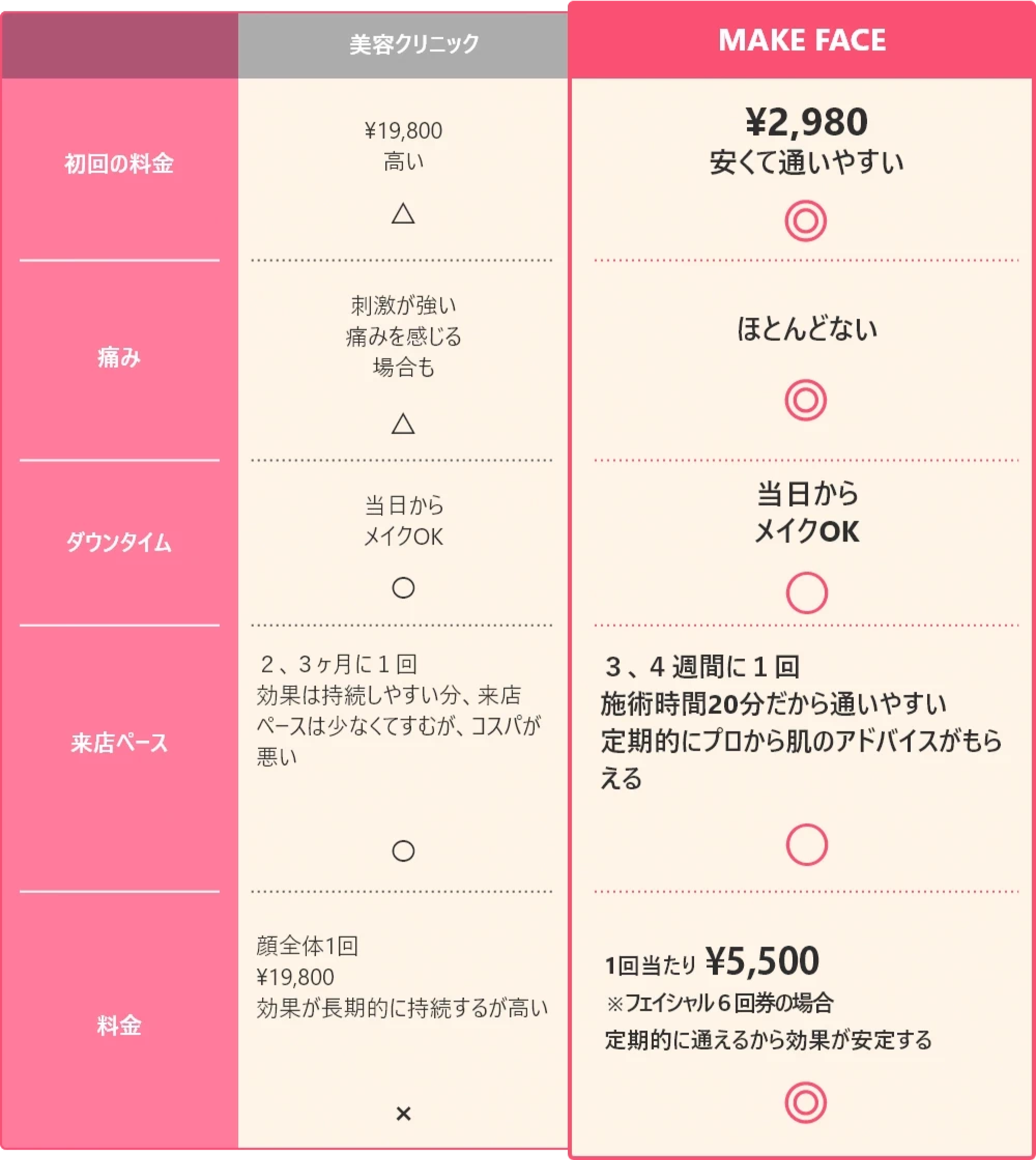 初回でも顔のトーンが明るくなるのを実感いただく方もいらっしゃいます。毛穴の黒ずみや小じわ、ほうれい線、ニキビ跡の改善にも効果があります。